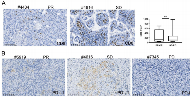 研究采用三项关键技术方法:1)回顾性收集71例铂耐药患者临床资料,建立治疗反应数据库;2)使用LEGENDplex?多因子检测平台定量13种血清细胞因子;3)通过免疫组化分析CD8+T细胞浸润和PD-L1(CPS评分)表达。样本来源于中山大学肿瘤防治中心2017-2022年收治患者。