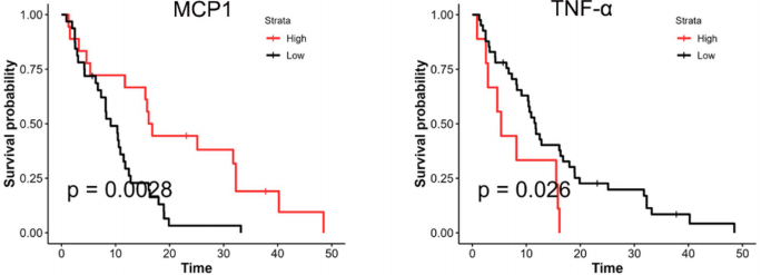 细胞因子与生存关联:高IFN-α2(>0.98pg/mL)、IL-1β(>24.47pg/mL)、IL-12p70(>1.87pg/mL)患者OS显著延长(p<0.05)。MCP-1>390.58pg/mL组PFS和OS均改善,而TNF-α低水平者PFS更优。