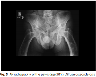 患者3岁首发骨折,伴随颅骨增宽、胸廓畸形等特征性表现。生化检测显示碱性磷酸酶(ALP)高达正常值15倍,骨转换标志物显著升高。影像学呈现典型的"骨中骨"征象、弥漫性骨硬化及长骨弯曲畸形(