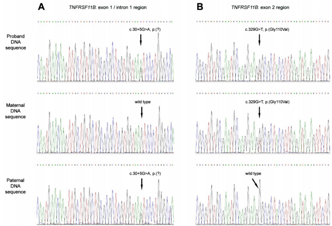 遗传分析显示,c.30+5G>A变异通过破坏内含子1的5'剪接位点,可能引起外显子1跳跃;而c.329G>T导致的Gly110Val替换位于CRD III结构域,直接影响OPG与RANKL的结合能力(