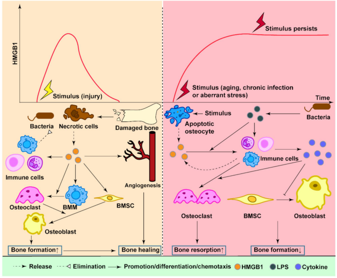 局部应用3S-HMGB1(模拟fr-HMGB1)在糖尿病大鼠模型中显著改善骨整合,而中和抗体可缓解慢性炎症性骨破坏。未来研究需明确:①不同病理状态下RAGE/TLRs的优先激活模式;②骨细胞与其他细胞源HMGB1的贡献度;③疾病阶段转换中ds/fr-HMGB1比例动态变化。