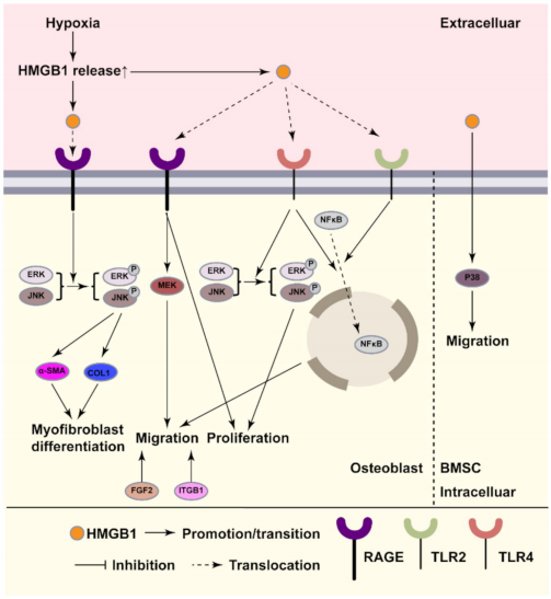 在破骨细胞方面,RANKL通过NOX1/ROS/p38通路抑制HO-1,触发HMGB1释放。胞外HMGB1通过TLR4促进前体细胞分化,并通过RAGE介导肌动蛋白重构完成成熟。成骨细胞中,HMGB1激活RAGE/MEK和TLR/NF-κB通路,促进迁移增殖。有趣的是,低氧条件下HMGB1-TLR4激活ERK/JNK可增强MG-63细胞增殖,而通过RAGE则诱导纤维化转变。
