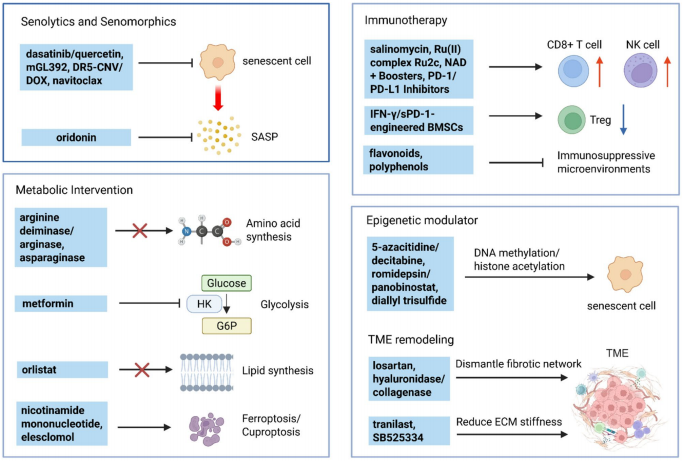 创新疗法呈现多元化趋势:靶向衰老的"精准爆破"策略包括mGL392纳米颗粒递送达沙替尼,DR5-CNV/DOX选择性清除衰老细胞;代谢干预如精氨酸酶剥夺ASS1缺陷型肿瘤,烟酰胺单核苷酸(NMN)恢复NAD+水平;表观遗传调节剂5-氮杂胞苷联合HDAC抑制剂重塑染色质景观。