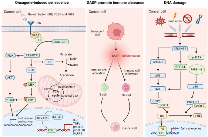 抑癌机制方面,OIS通过激活p16INK4a/RB和p53/p21通路阻止癌前病变发展。DNA损伤时,ATM/ATR-CHK1/2-p53-p21级联反应触发衰老,而BRCA1缺失会削弱这种保护。短期SASP分泌IL-6、IL-8等因子招募NK细胞和T细胞清除衰老细胞,形成天然抗癌免疫。