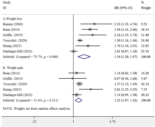 分析显示,与体重稳定者相比,体重损失患者的全因死亡风险显著增加54%(HR 1.54,95% CI 1.20-1.97),且在非转移性/局限性前列腺癌亚组中保持显著(HR 1.38)。体重增加同样使全因死亡风险升高23%(HR 1.23),在非转移性疾病中更为明显(HR 1.25)。