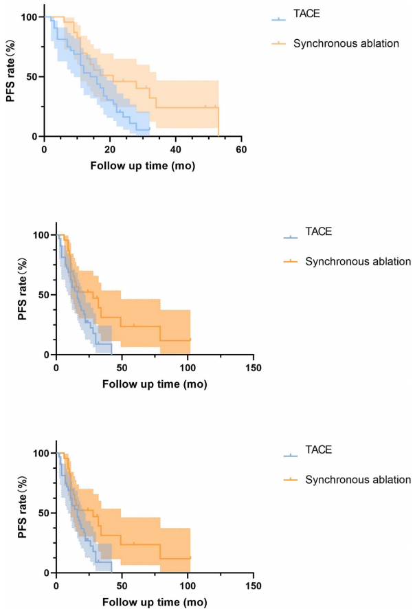 所有患者分析显示,虽然同步消融组的中位PFS(19.0月)略高于TACE组(18.3月),但差异未达统计学意义(P=0.134)。在OS方面,两组的中位OS分别为59.0月和46.8月(P=0.465),同样无显著差异。