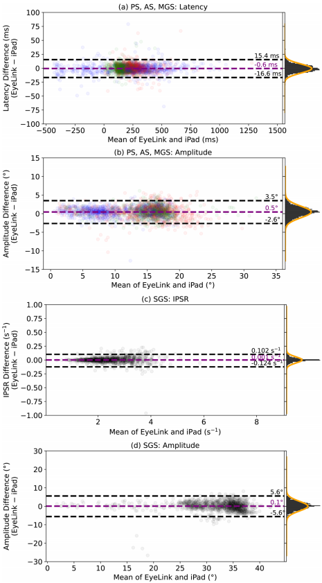 "Saccade-level iPad performance"部分显示,iPad与EyeLink在扫视水平上具有良好一致性。Bland-Altman分析表明,95%的扫视水平差异在PS、AS和MGS任务中潜伏期为-16.6至15.4ms,振幅为-2.6°至3.5°;在SGS任务中瞬时主扫视率(IPSR)为-0.124至0.102 s-1,振幅为±5.6°。误差分布近似正态且无明显趋势。