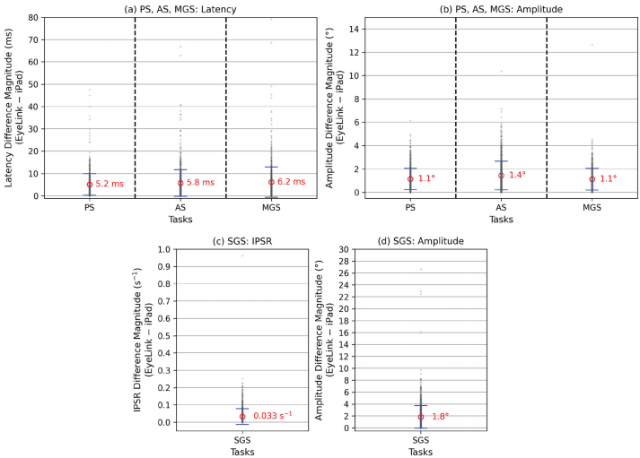 "Expected saccade changes in PD"部分通过文献综述建立了临床意义基准。分析22项研究发现,PD患者与健康对照在AS任务中的潜伏期差异通常≥60ms,振幅差异≥-1.8°;在SGS任务中IPSR差异≥-0.47 s-1,振幅差异≥-1.4°。这些差异远超iPad的测量误差,支持其临床适用性。