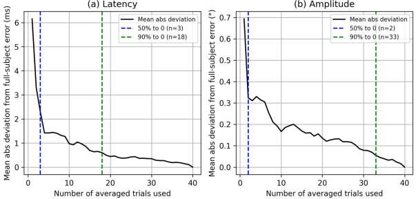 "Subject-level iPad performance"部分显示,在受试者水平上误差进一步降低。PS、AS和MGS任务的平均潜伏期误差仅2ms,振幅误差0.7°;SGS任务的IPSR误差0.003 s-1,振幅误差1.6°。收敛分析表明仅需18次试验即可使潜伏期误差收敛90%。