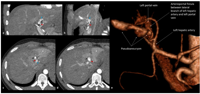 高处坠落(28.6%)和机动车事故(MVA)(30.6%)是导致肝脾联合损伤的主要原因。图3展示的案例中,180km/h车速导致的碰撞不仅造成脾脏活动性出血,还引发了肝右动脉分支的假性动脉瘤。