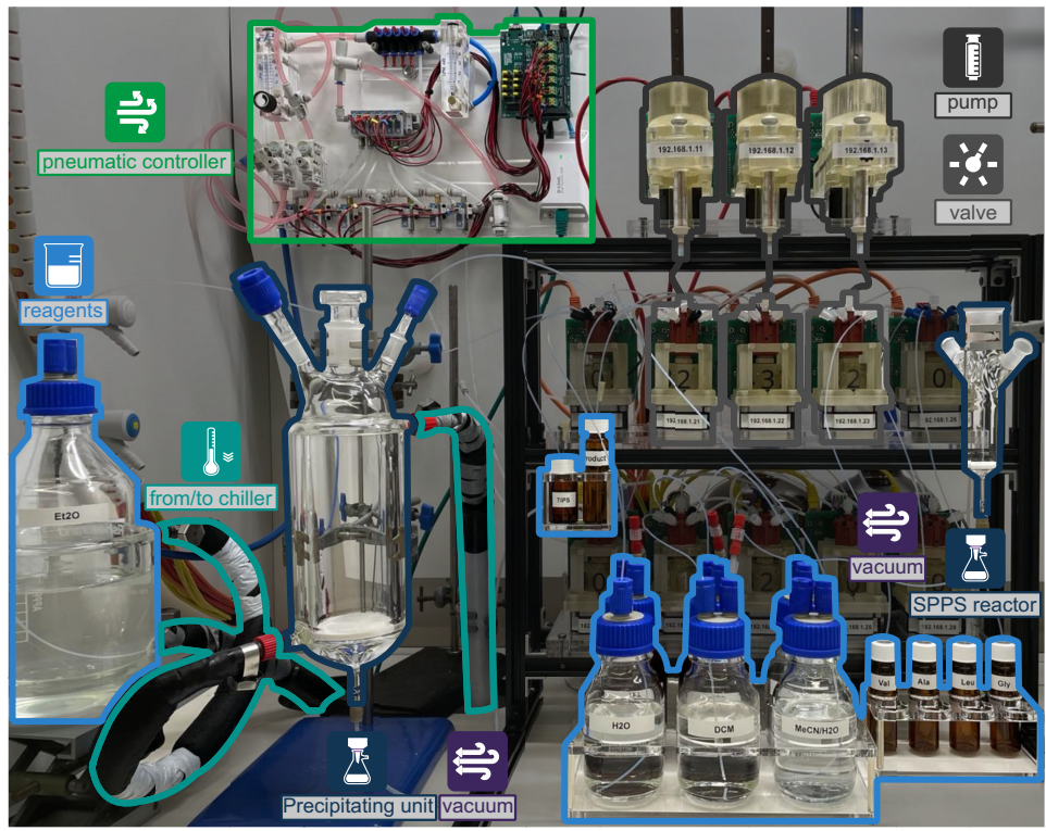 在生物医药领域,肽类化合物因其高特异性和低毒性成为药物开发的热点。然而传统固相肽合成(SPPS)技术存在两大痛点:一是商业合成仪仅能完成线性组装,复杂修饰需人工干预;二是专用平台无法兼容多样化化学反应。这些问题严重制约了结构复杂肽类药物的研发效率。