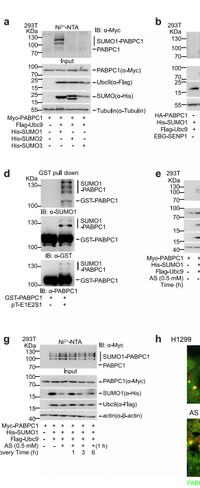 PABPC1 SUMO化受多种应激动态调控:通过Ni2+-NTA pull down和变性免疫沉淀证实,氧化应激(砷酸盐处理)、热休克等均可诱导PABPC1 K512位点SUMO1修饰,该修饰可被去SUMO化酶SENP1逆转。