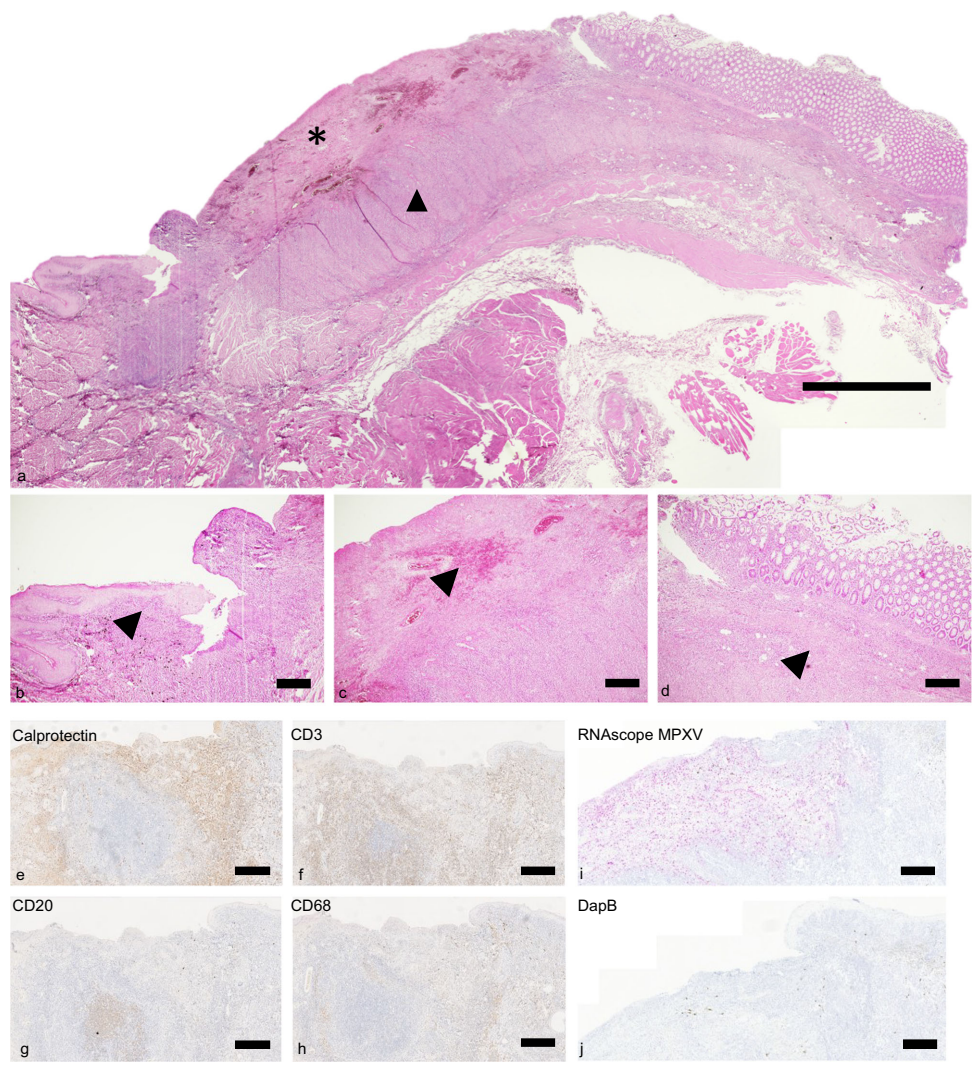 研究团队通过直肠途径接种1×107 pfu MPXV clade IIb后,成功复制了人类患者的临床特征:直肠炎、生殖器皮肤病变和精液病毒脱落。值得注意的是,与皮内接种相比,单纯直肠感染诱导的中和抗体反应较弱且延迟,这提示传播途径显著影响免疫应答特征。组织病理学显示:
