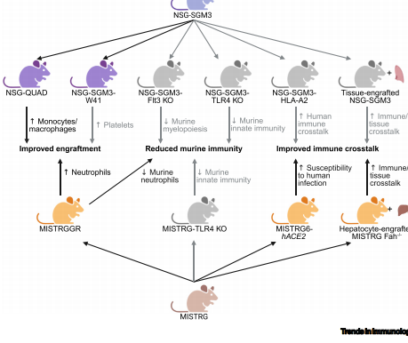 本文聚焦人源化小鼠模型在先天免疫研究中的瓶颈问题,通过比较NSG-SGM3(表达人SCF/GM-CSF/IL-3)与MISTRG(人源化M-CSF/IL-3/GM-CSF/TPO/Sirpα)两种髓系重建模型,系统分析了其在感染、肿瘤等研究中面临的MAS(巨噬细胞活化综合征)、血小板缺陷等挑战,并提出引入KITW41突变、HLA-A2转基因等改进策略,为人类特异性免疫应答研究提供新工具。