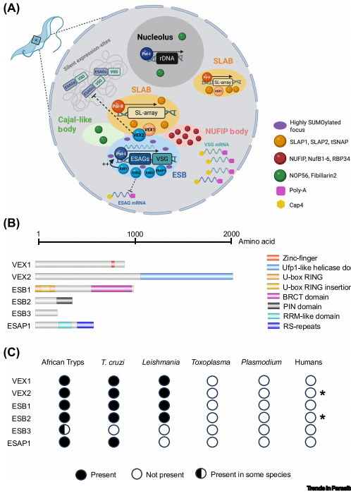 布氏锥虫通过表达位点体(ESB)专一性转录单个VSG基因,其他VSG表达位点(VSG ESs)则被沉默并空间隔离。ESB特异性蛋白ESB1(转录激活因子)和VEX2(RNA解旋酶)分别调控活性VSG的转录和沉默位点的排斥。VEX2形成的生物分子凝聚体通过连接活性VSG基因与SL-array(反式剪接关键元件),确保单个VSG的高效表达和等位基因排斥。