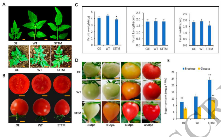 在番茄模型中,miR164过表达导致叶片缩小、锯齿减少和果实心室数减少等发育异常,而STTM沉默株则出现更深锯齿。更重要的是,沉默miR164使果实葡萄糖和果糖含量分别提升61.17%和74.78%,而过表达则降低23.58%和12.03%