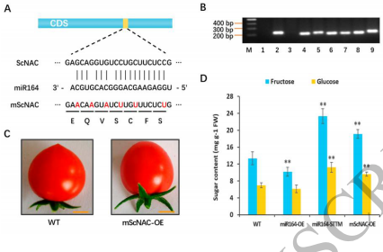 在番茄中过表达miR164抗性突变的mScNAC(保持氨基酸不变)可重现miR164沉默株的高糖表型