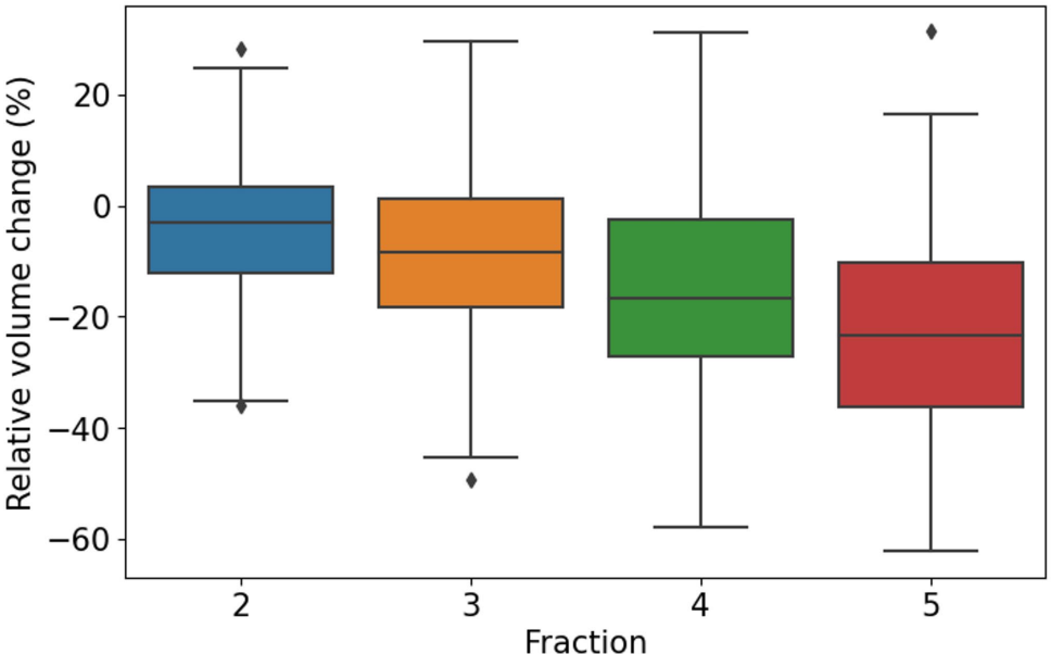 研究观察到从第1至第5分次间肿瘤体积中位数减少23%(范围:-62%-32%),这一早期响应模式与长程放化疗研究报道相符,为动态调整治疗策略提供了影像学依据。