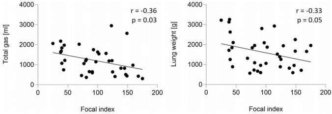 该指数与膈背侧非通气区域呈强正相关(r=0.67, p<0.01),与总气体量负相关(r=-0.36, p=0.03)。值得注意的是,通气参数(PEEP、潮气量等)对指数无显著影响,说明形态特征主要由疾病本身决定。专家验证环节中,36/37例"弥漫性"患者的CT经聚焦指数分析后,显示出被主观评估掩盖的异质性谱系。