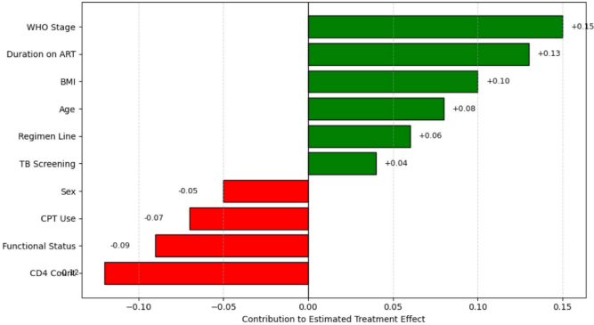 研究采用三项关键技术:1)基于电子病历的观察性研究设计,纳入4152例≥15岁的HIV患者纵向数据;2)因果森林DML框架,结合随机森林回归器和分类器分别建模结局和干预分配;3)条件平均处理效应(CATE)分析,通过SHAP值评估特征重要性。研究通过80/20数据分割和倾向评分修剪(20-80%)确保模型稳健性。