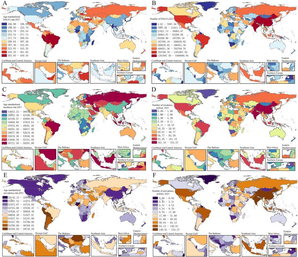 研究发现2021年全球口腔疾病ASDR(年龄标准化DALYs率)呈现"双峰分布":最高值出现在玻利维亚(459.45/10万),最低值在日本(89.23/10万)。