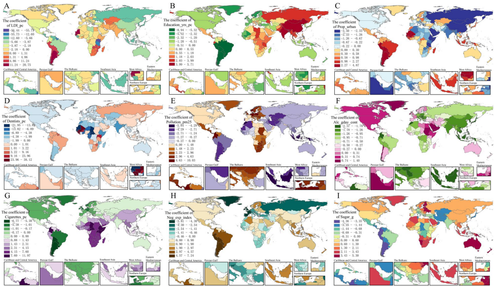 GWR分析发现牙医密度每增加1/万人,高收入国家ASIR可降低12.7%,但在撒哈拉以南非洲反而升高8.3%。