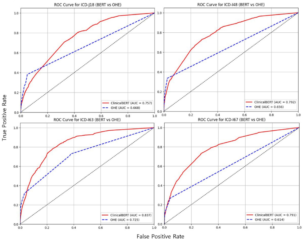 在10类心脏相关ICD-10编码预测中,ClinicalBERT的AUC(0.864±0.028)显著优于OHE(0.795±0.089)。特别在脑梗死(I63)预测上,AUC提升15.4%。
