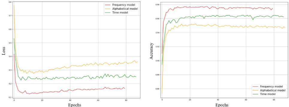 通过对比时间排序、字母排序和频率排序三种方法,发现频率排序的ClinicalBERT模型验证损失最低(0.124),较时间模型降低45%。
