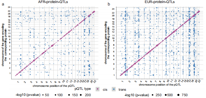 "祖先特异性QTL"部分通过标准化效应值比较发现,约10-30%的QTLs具有祖先特异性。例如,HSF2B蛋白仅在非洲血统中显示显著pQTL,而载脂蛋白A-V(Apo A-V)的调控仅在欧洲血统中显著。这种差异可能与变异等位基因频率(MAF)的祖先间差异有关——MAF差异越大,QTL越可能呈现祖先特异性。