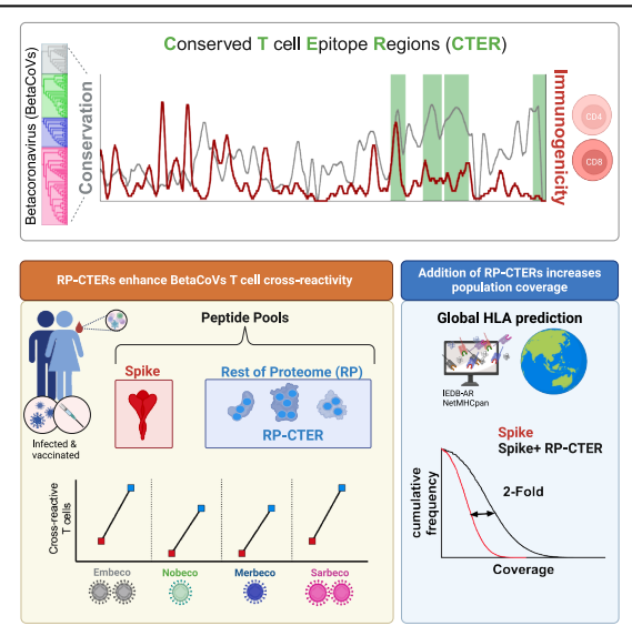 Betacoronavirus(β冠状病毒)的频繁跨种传播对全球公共卫生构成持续威胁。本研究通过整合表位图谱与序列保守性分析,鉴定出占SARS-CoV-2蛋白组12%的保守T细胞表位区域(CTERs),证实其可诱导针对多种β冠状病毒亚属的交叉反应性T细胞应答。特别发现非刺突蛋白(non-S)CTERs能显著增强T细胞交叉反应潜力并提高HLA(人类白细胞抗原)覆盖率,为开发广谱冠状病毒疫苗提供了新思路。