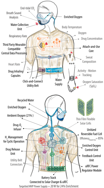 关键技术包括:1)基于uRFC的双模式氧生成/能量回收系统;2)多参数可穿戴传感器阵列(监测SpO2、呼吸频率等);3)AI驱动的自适应控制算法;4)太阳能-氢能混合供电方案。研究团队通过六个阶段(从台式原型到动物实验)验证了系统可行性。