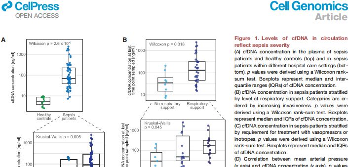 脓毒症作为全球每年导致1100万人死亡的危重症,其病理机制和早期诊断始终是重症医学领域的重大挑战。传统生物标志物如CRP和降钙素原虽广泛应用,但难以反映器官特异性损伤。循环游离DNA(cfDNA)作为新兴液体活检标志物,在肿瘤和产前诊断中表现突出,但其在脓毒症中的生物学特征和临床价值尚不明确。牛津大学(University of Oxford)的研究团队通过创新性的多组学研究,揭示了cfDNA在脓毒症中的独特景观。