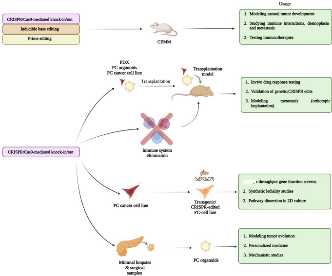 CRISPR技术极大简化了基因工程小鼠模型(GEMMs)的创建。通过Pdx1-Cre与LSL-KRASG12D系统结合CRISPR敲除Lkb1,可加速胰腺肿瘤发生。更复杂的多基因编辑(如KRASG12D+TP53-/-+SMAD4-/-)则通过AAV递送实现。类器官模型通过CRISPR敲入KRAS突变并联合CDKN2A等抑癌基因缺失,成功模拟了人类PDAC的异质性。值得注意的是,CRISPR介导的染色体大片段重组(CRISMERE)为研究基因组结构变异提供了新工具。