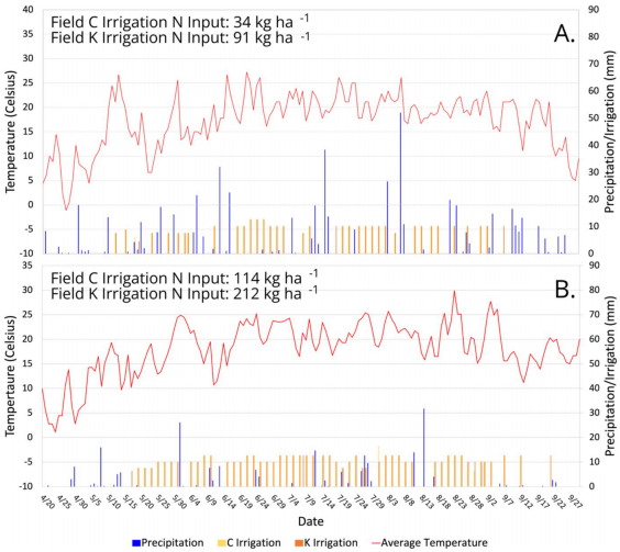 研究显示年际气候差异显著:2022年降水530 mm,而2023年仅214 mm导致灌溉量激增(最高629 mm)。这直接影响了来自灌溉水的"隐形氮"输入,在硝酸盐浓度33.3 mg L-1的K地块,2023年通过灌溉输入的氮高达212 kg ha-1,相当于常规施肥量的85%。这种环境变异为理解品种差异提供了天然实验场。