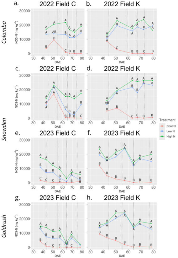 高氮处理(350 kg ha-1)使所有品种叶柄NO3-N在块茎膨大后期显著升高(P<0.0001),但Colomba的产量对此无响应,而Snowden和Goldrush的响应则取决于地块。特别值得注意的是,K地块对照组的叶柄NO3-N值比C地块高约5000 mg kg-1,这直接印证了灌溉水硝酸盐的贡献。