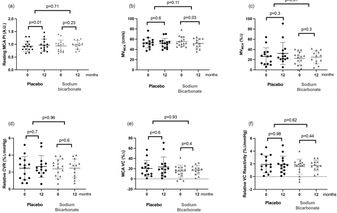 安慰剂组MCA脉动指数显著升高(p<0.05),而NaHCO3组保持稳定。NaHCO3组MCA平均血流速度显著降低(p=0.03),但脑血管反应性和血管传导性无显著变化。