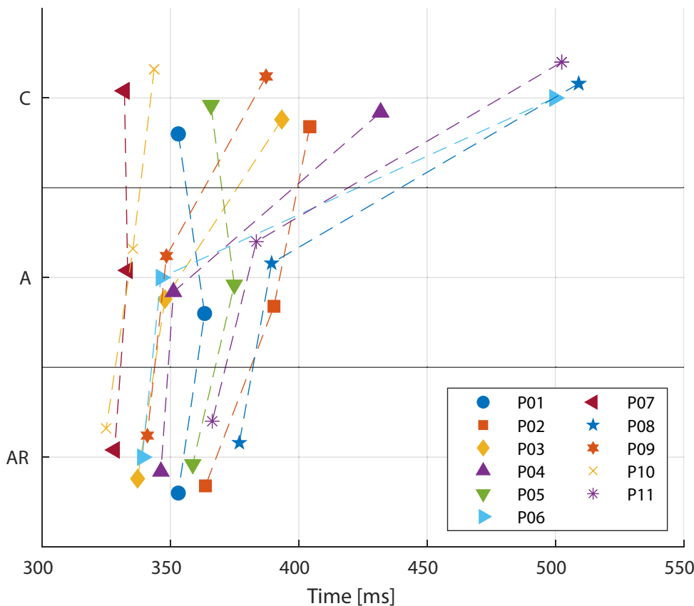 结果显示清醒状态下膝关节屈曲时间中位数(404 ms)显著长于麻醉状态(355 ms)和麻醉+松弛状态(349 ms)。Friedman检验证实AR状态与清醒状态(p<0.001)、AR与单纯麻醉状态(p=0.004)差异具有统计学意义。值得注意的是,仅15%清醒试验中VL保持完全静息,且这些"伪被动"试验的屈曲时间仍比AR状态平均长39.8 ms。