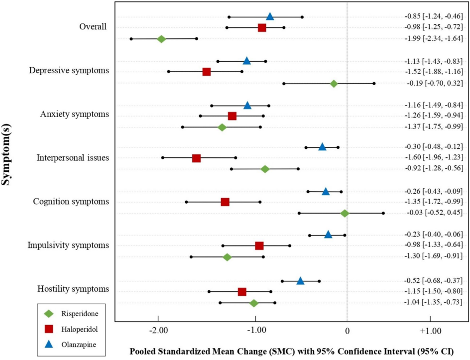 人际困难:氟哌啶醇效果最佳(SMD=-1.60),可能是其减少敌意感知的结果;利培酮(SMD=-0.92)和奥氮平(SMD=-0.30)效果递减。