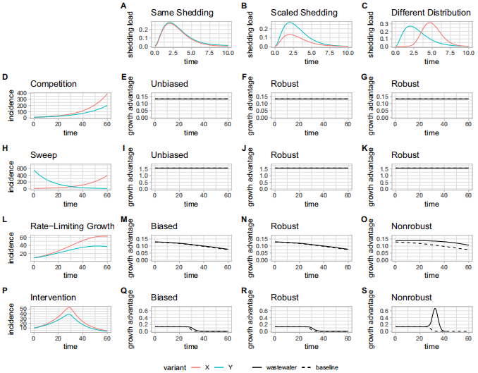 通过推导闭合表达式证明,在恒定传播率假设下,污水估算的选择优势完全不受脱落差异影响。即使放松该假设,仅当变异株脱落时间分布形状不同时才会引入偏差,而总脱落量差异仍不影响结果稳健性。