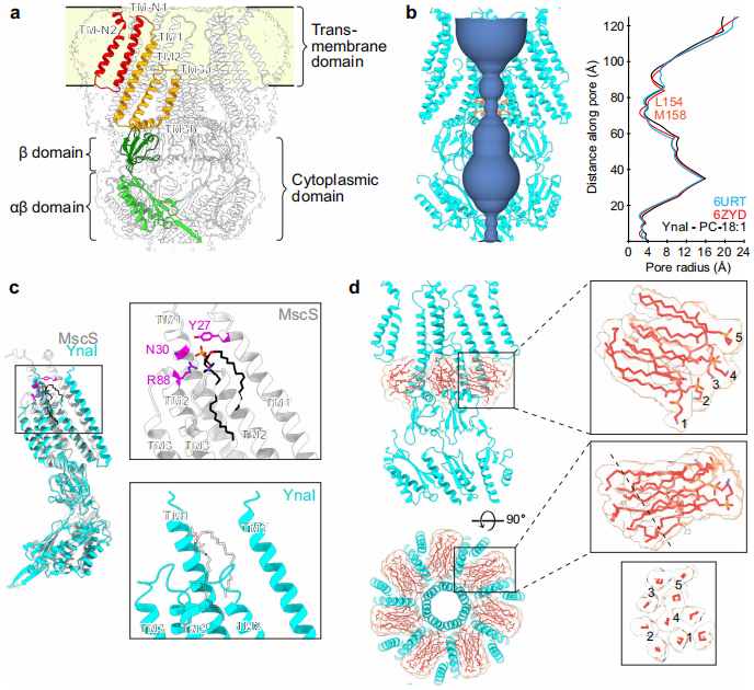 "闭合静息态的YnaI结构"显示,与MscS相比,YnaI的孔隙半径更小(