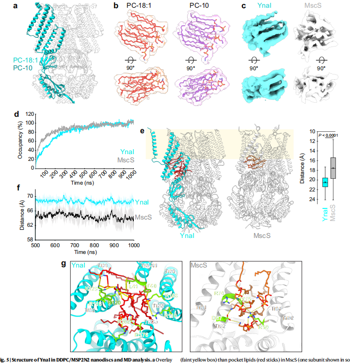"YnaI口袋脂质不与膜自由交换"通过分子动力学模拟揭示,YnaI口袋脂质填充速度比MscS慢4倍(