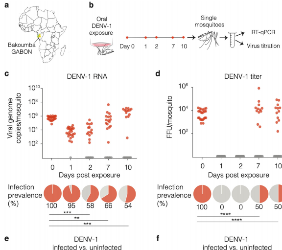 通过监测DENV-1在蚊虫体内的动态,发现病毒RNA在吸血后48小时出现"蚀斑期",此时感染与非感染个体中肠转录组差异最显著。