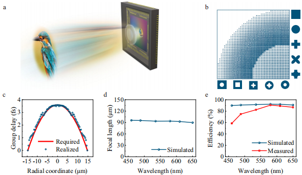 通过建立1300nm高Si3N4元单元库,计算显示当数值孔径(NA)为0.155时,460-650nm波段光可聚焦于93.5μm处(偏差<1.6%),理论平均效率达91.2%。公式(1)描述的相位补偿模型与公式(2)的群延迟计算表明,增加纳米柱高度可有效扩展群延迟范围。