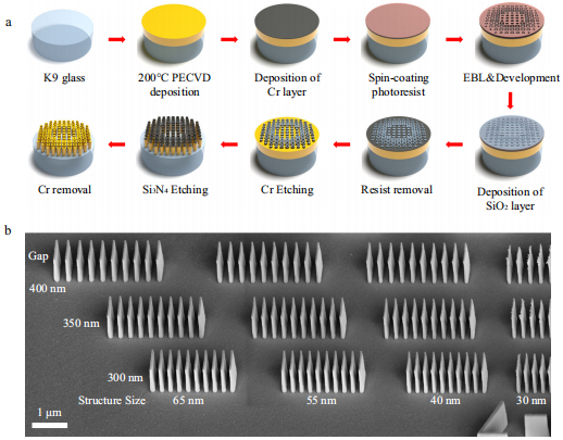 创新性地采用Cr硬掩模与梯度气体比例ICP刻蚀,实现侧壁垂直度89-90°的纳米结构。