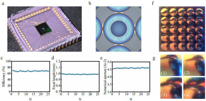 实验测得实际焦距97.33μm(偏差5%),平均效率80.39%,斯特列尔比(Strehl ratio)保持0.88。USAF分辨率测试卡成像验证了2.19μm线宽分辨能力,全彩成像未见色差。