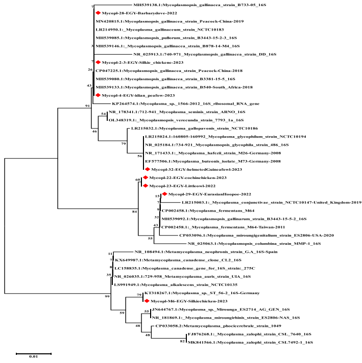 埃及野生与圈养鸟类群体中支原体(Mycoplasma)的流行特征及系统发育分析