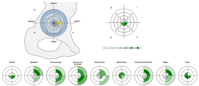 正常组股骨头凹100%位于中央区,59%集中于前下象限。DDH组则显著前上移位(P<0.001),38%进入外周区,这种"高位股骨头凹"(fovea alta)现象与既往报道吻合。