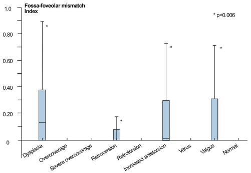 DDH组FFM指数最高(中位数0.13),显著高于正常组(0.0)和股骨过度前倾组(0.02)。图5B展示典型病例中股骨头凹超出髋臼凹范围的情况。