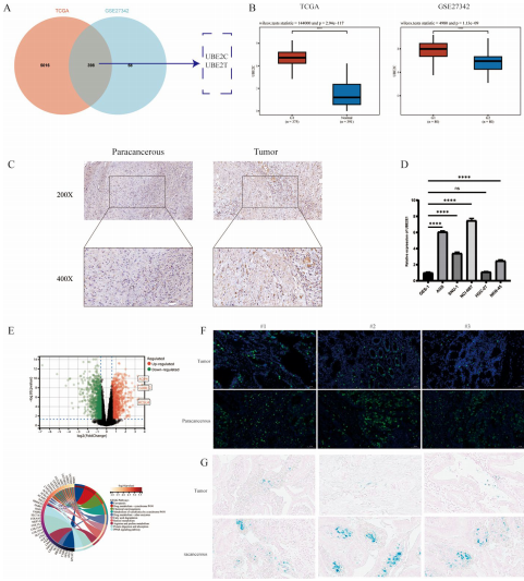 通过分析375例胃癌和391例正常组织的TCGA数据,发现UBE2C在肿瘤组织中显著上调(log2FC>1),与ACSL4表达呈负相关。RNA-seq显示UBE2C敲除后336个差异基因富集于铁死亡通路,普鲁士蓝染色证实胃癌组织存在铁沉积减少特征。
