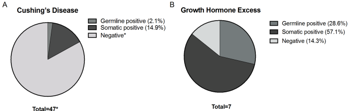 肿瘤基因检测方面,45例样本中检出11例(24.4%)体细胞变异:GHE组中57.1%(4/7)携带GNAS激活突变,CD组中15.8%(6/38)存在USP8突变。此外,一例特殊肿瘤同时检出PRKAR1A、TP53和MEN1三个基因的致病突变。